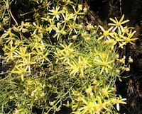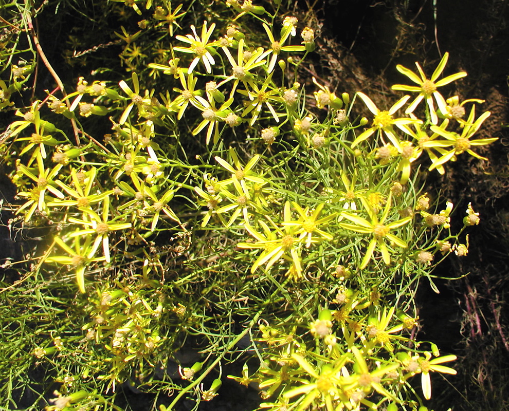 Broom groundsel is a short-lived perennial reaching two to three feet in height that typically grows in plains and shrublands, often colonizing disturbed ground. Individual plants send up many stems from a taproot creating a rounded or hemispherical-shaped plant with a somewhat open airy appearance. The stems are all about the same height and each stem may have a woody base with leaves emerging from the stem in an alternate arrangement all along the length of the stem. Leaves are bright green in color, usually smooth and narrow, and up to four inches long. Some leaves may be irregularly divided into thin segments and often the lower leaves quickly become withered.