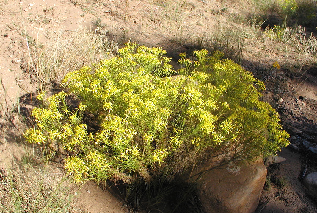 A large variety of yellow-flowered plants can be found on the Preserve throughout the growing season, especially composites (members of the sunflower, or daisy family; Asteraceae) and sometimes their specific identification can be challenging. In the fall one of our most obvious and vibrant yellow-flowering composites is broom groundsel, Senecio spartioides. The genus Senecio was named by Linnaeus in 1753 from the Latin word for old man, senex, because of the whitish downy hairs covering the seed heads in this genus. Senecio, with over 1,000 species worldwide, is one of the largest genera in existence, although some taxonomists have recently proposed revisions that would move many of the species out of this genus. Senecio species are commonly known as groundsels or ragworts and there are 20 species native to New Mexico. The species name spartioides means resembling the genus Spartium, a group in the legume family, Fabaceae. Other common names for broom groundsel are broom-like ragwort, many-headed groundsel, grass-leaved ragwort, and broom butterweed.
