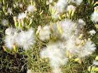The flowers of broom groundsel may appear from July through October and typically form a dense layer of flat-topped clusters. Because all the blossoms occur at the same level, plants in bloom do resemble the head of a broom pointing skyward. Each single flower head has relatively few ray flowers (usually 4 – 8) with long thin bright yellow petals. The gold-colored disk flowers are more numerous, but much smaller. Individual flower heads arise from a cylindrical base (technically called an involucre) that is covered by smooth, leaf-like structures called phyllaries. The number, size, shape, and surface features of these tiny structures are often used to distinguish between species in this group of plants. Each of the flowers in the head has the potential, if successfully pollinated, to develop into a seed adorned by a crown of fluffy white soft bristles that function in seed dispersal by wind (and, coincidentally can be reminiscent of an old man’s head).