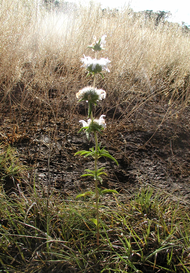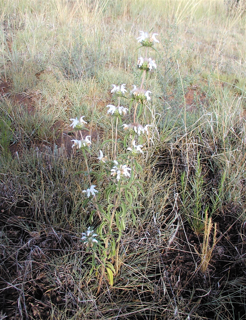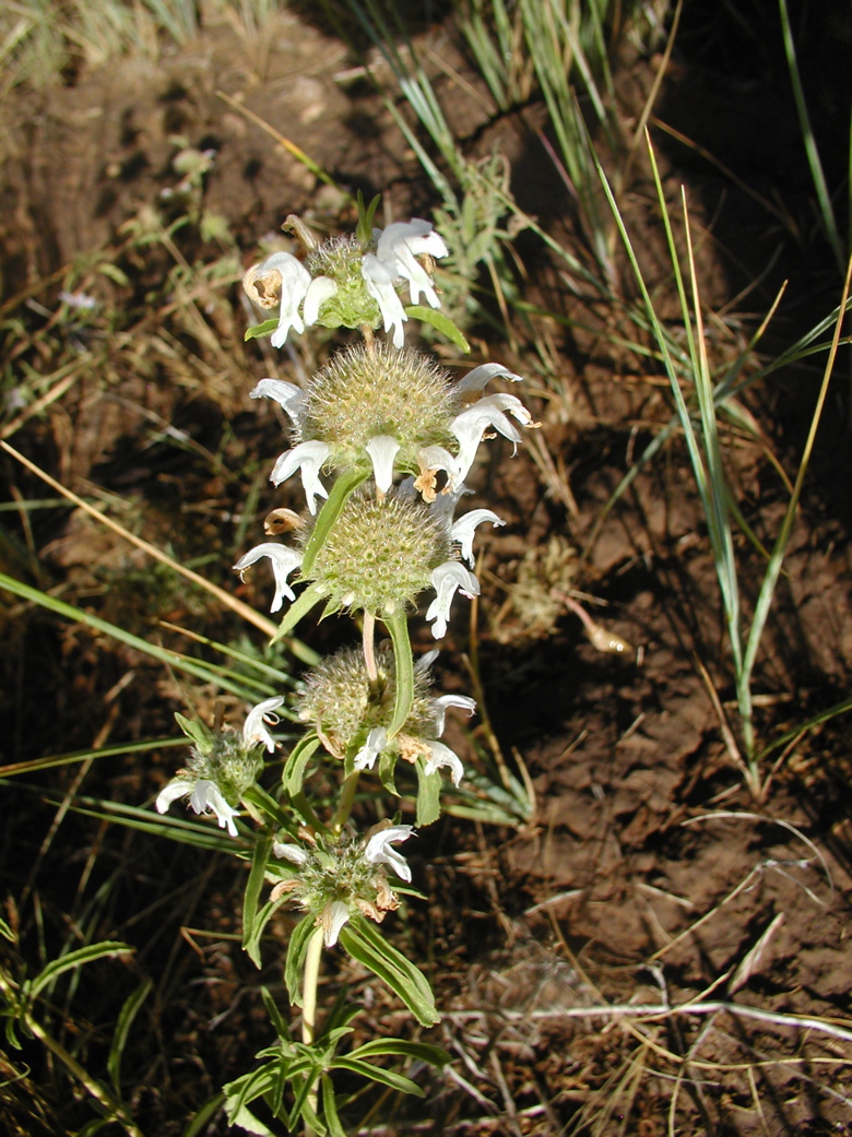 Plains beebalm is an annual herb usually found in sandy plains, pastures, dry washes, and open areas of piñon-juniper woodlands. Plants may have one or more stems growing to a height of 16 inches. Each main stem may branch farther up the stem and all stems are covered with short, downward-curving hairs. Thin lance-shaped leaves with finely toothed edges up to two inches long are born on short petioles. Mounded flower clusters may appear from June through September in the upper leaf axils. Leaves associated with the flowers range in color from green to pink and the flowers are white to pink, sometimes with purple spots. The five sepals join to form a tube tipped by spiny hairs and the five petals form a distinctive curved two-lipped tube about one inch long. The upper lip of each floral tube is arched with a rounded top and the lower lip ends with three lobes.