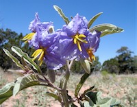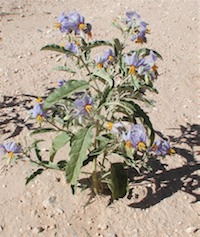 The distinctive blossoms with pale violet, swept-back petals and stamens sticking out like five golden tongues make the silverleaf nightshade easy to recognize. Even when it is not in bloom, the plant can be readily identified based on its long, narrow, silvery leaves with wavy edges. Solanum elaeagnifolium is a member of the nightshade family (Solanaceae), notorious for producing alkaloids, some of which are narcotic. Yet this family also includes some of our most well liked and widely used crops including tomatoes, potatoes (in the genus Solanum), tobacco, and our New Mexico favorite, chilies. The genus name Solanum comes from two Latin words, solor meaning to comfort or relieve and anum meaning pertaining to. So the name means comforting, referring to the medicinal and/or narcotic properties of some species, particularly the analgesic effects of certain alkaloids. Members of this genus are commonly referred to as nightshades or horsenettles and there are seven Solanum species native to New Mexico.