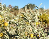 The silverleaf nightshade is considered to be a weed in most places because of its ability to colonize disturbed ground by seeds and then quickly spread as new plants emerge from the established root system. Both the leaves and the berries are poisonous to livestock, but plants are rarely consumed, perhaps because of the tough, spiny stems. In addition to collecting fruits for use in decorative necklaces, Native Americans had a variety of medicinal uses for silverleaf nightshade from the treatment of toothaches, sore throats, and snakebites to use as a laxative and an antiseptic. The Pimas of Arizona took advantage of a chemical in the fruits that curdles milk and used crushed berries in making cheese. Despite its reputation as a weed, silverleaf nightshade undeniably produces colorful and interesting flowers and fruits in what is often an otherwise relatively drab habitat, and that, in my view, is sufficient to earn some level of respect and gratitude.