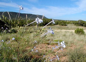 2009 has been a particularly good year for Ipomopsis longiflora on the Preserve as we have enjoyed expansive stands of flowering plants all summer long. I. longiflora is one of 13 species of Ipomopsis that are native to New Mexico; to date I have found three other species growing at Deer Canyon. A member of the phlox family (Polemoniaceae), blue trumpets have been used in Native American medicine for stomachache and other intestinal problems, as a disinfectant and a hair tonic, and for treating arthritis. Contrary to their trumpet moniker (which would imply a bold, even daring announcement), the presence of blue trumpets in the landscape makes a very light, almost whimsical statement adding a most valuable component to our ensemble of southwestern native wildflowers.