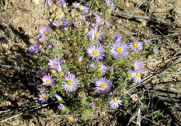 The tansy aster is an annual plant that typically grows in open, dry habitats and prefers sandy soil. Below ground it forms a taproot to acquire and store water and above ground the plant tends to branch extensively from its base. Consequently tansy aster plants are low-growing bushy plants, rarely exceeding 18 inches in height. Leaves are positioned in an alternate pattern along the stems and are highly dissected, giving the leaves a fern- like appearance. The leaves are a gray-green in color and form small spines at their tips.